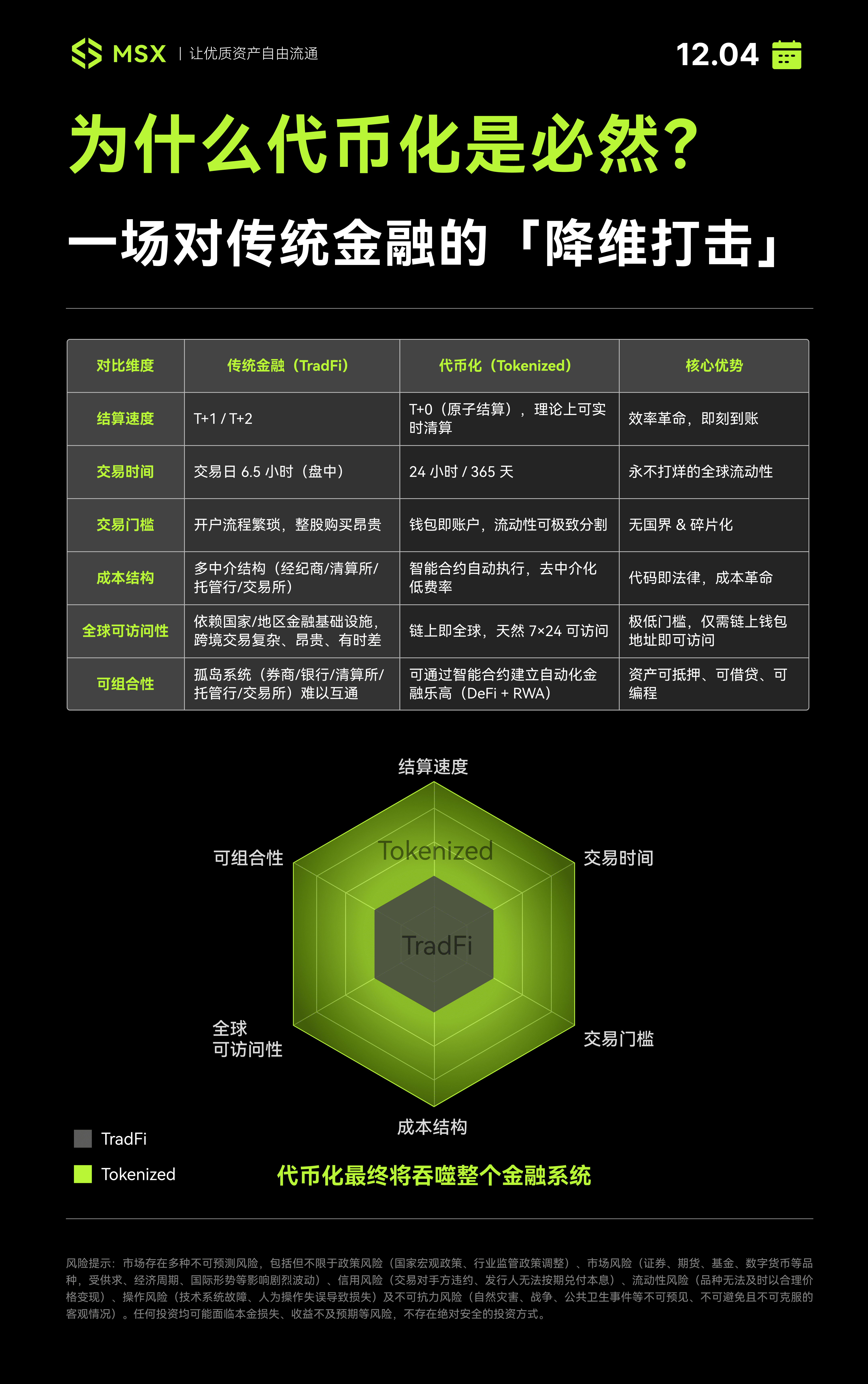结算效率:从 T+1 甚至更久,跨越到 T+0(实时清算),彻底消除对手方风险,据分析这将为全球基础设施每年节省上百亿美元的运营成本;