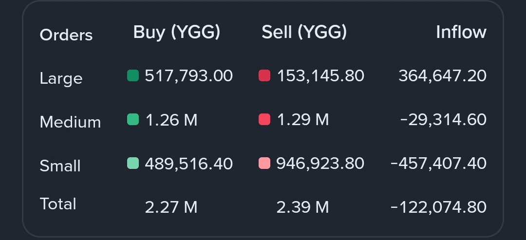 本分析可视化了 YGG 在一个小时内资本的流入和流出。图形和数据展示了购买和销售活动,按大型、中型和小型交易者的规模进行细分。这提供了市场情绪的即时视图,并帮助理解谁在提供流动性以及买方或卖方的压力在哪里。
