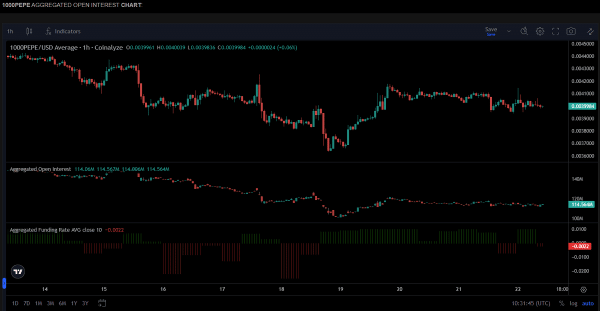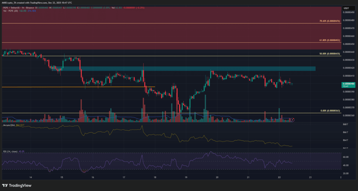 Coinalyze 数据显示,自 12 月 20 日以来,未平仓合约缓慢减少,从 $121.5 百万降至 $114.5 百万。随著短期横盘价格行动,这表明 PEPE 市场内的看空情绪及完全缺乏看涨信念。