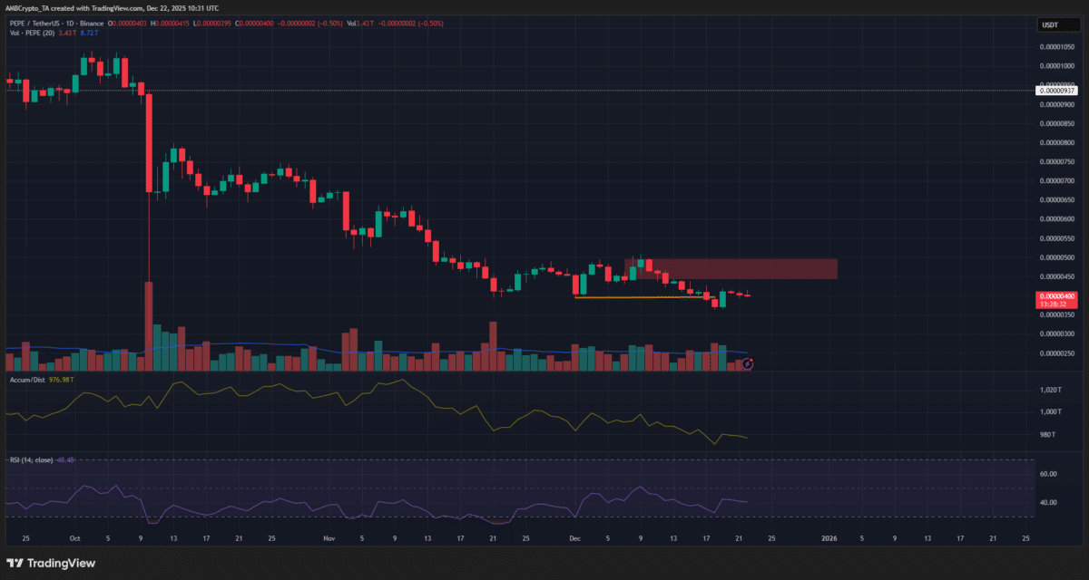 Pepe 持续向下趋势,过去 24 小时内下跌 2%。与 12 月的高点相比,下降了近 21%。