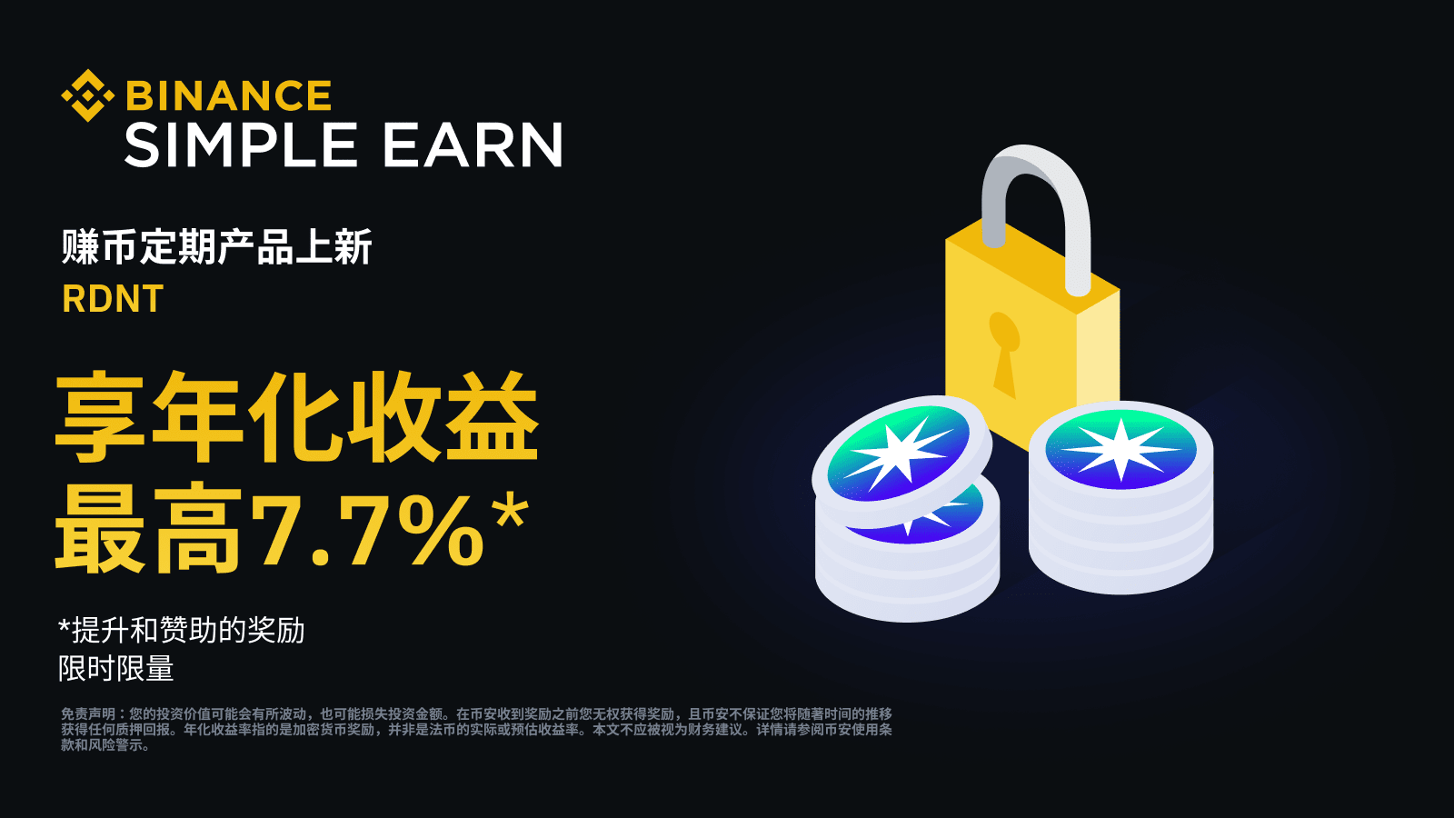币安赚币平台将推出RDNT定期产品专属活动!活动期间申购RDNT定期产品的用户,享最高7.7%年化收益率!
