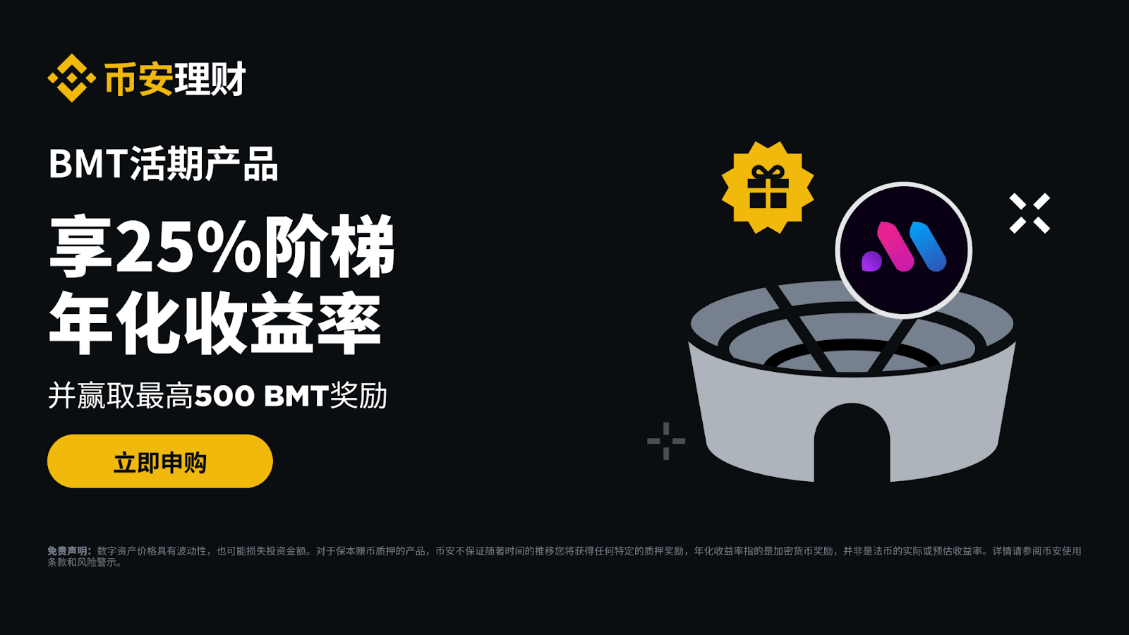 币安保本赚币平台推出Bubblemaps(BMT)保本赚币产品双重活动!活动期间,申购BMT活期产品的用户,可享受实时年化收益以及25%阶梯年化收益率!