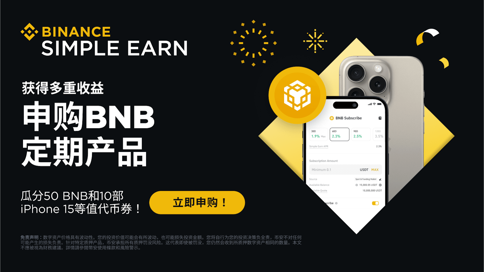 活动:申购BNB定期产品,瓜分50 BNB奖池和10部iPhone 15(128GB)等值代币券