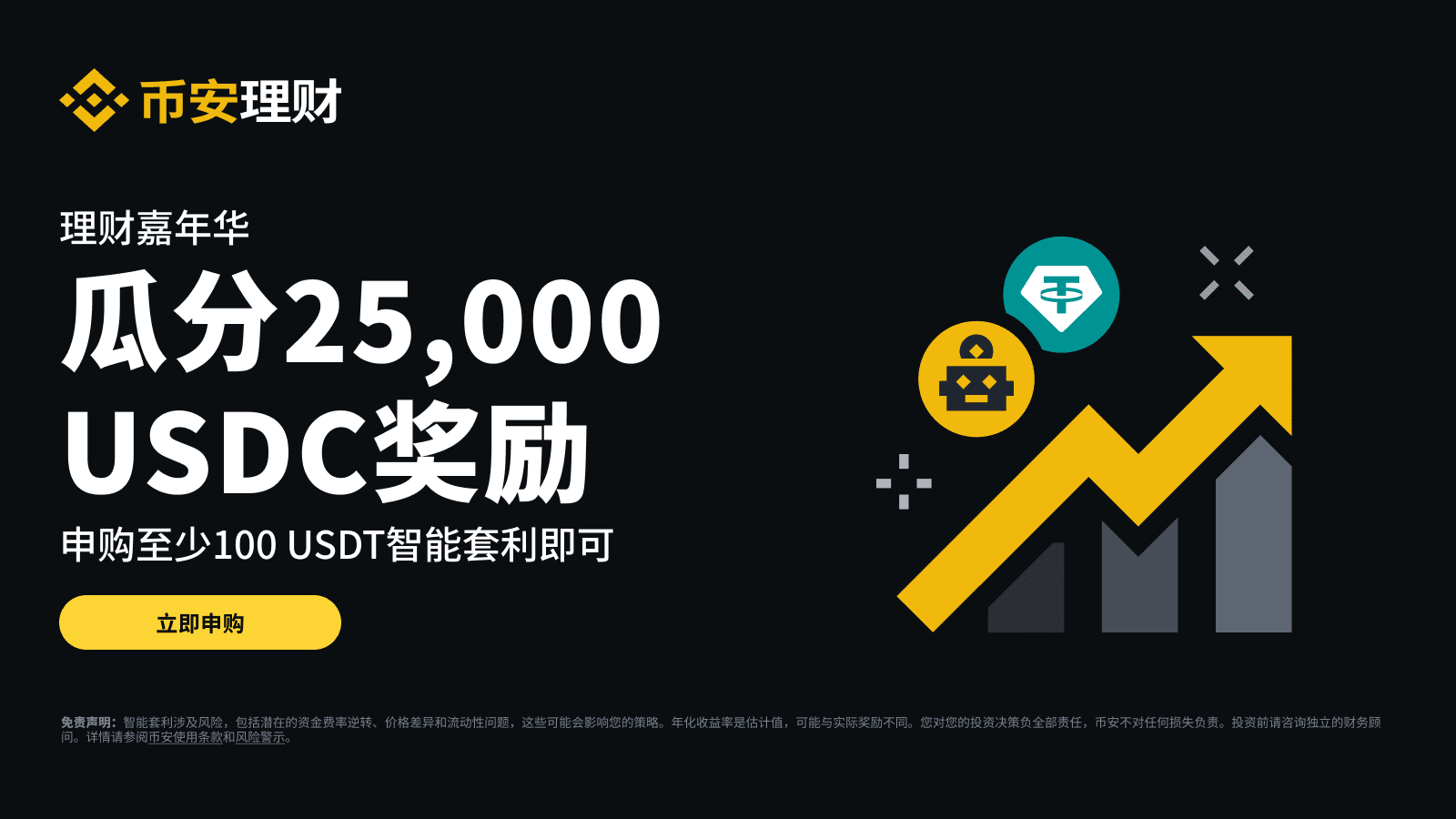 币安理财为符合条件的用户推出新的活动!币安理财嘉年华期间,申购任意智能套利的新老用户可享10.95%年化收益,且均有机会分享 25,000 USDC 代币券奖励。