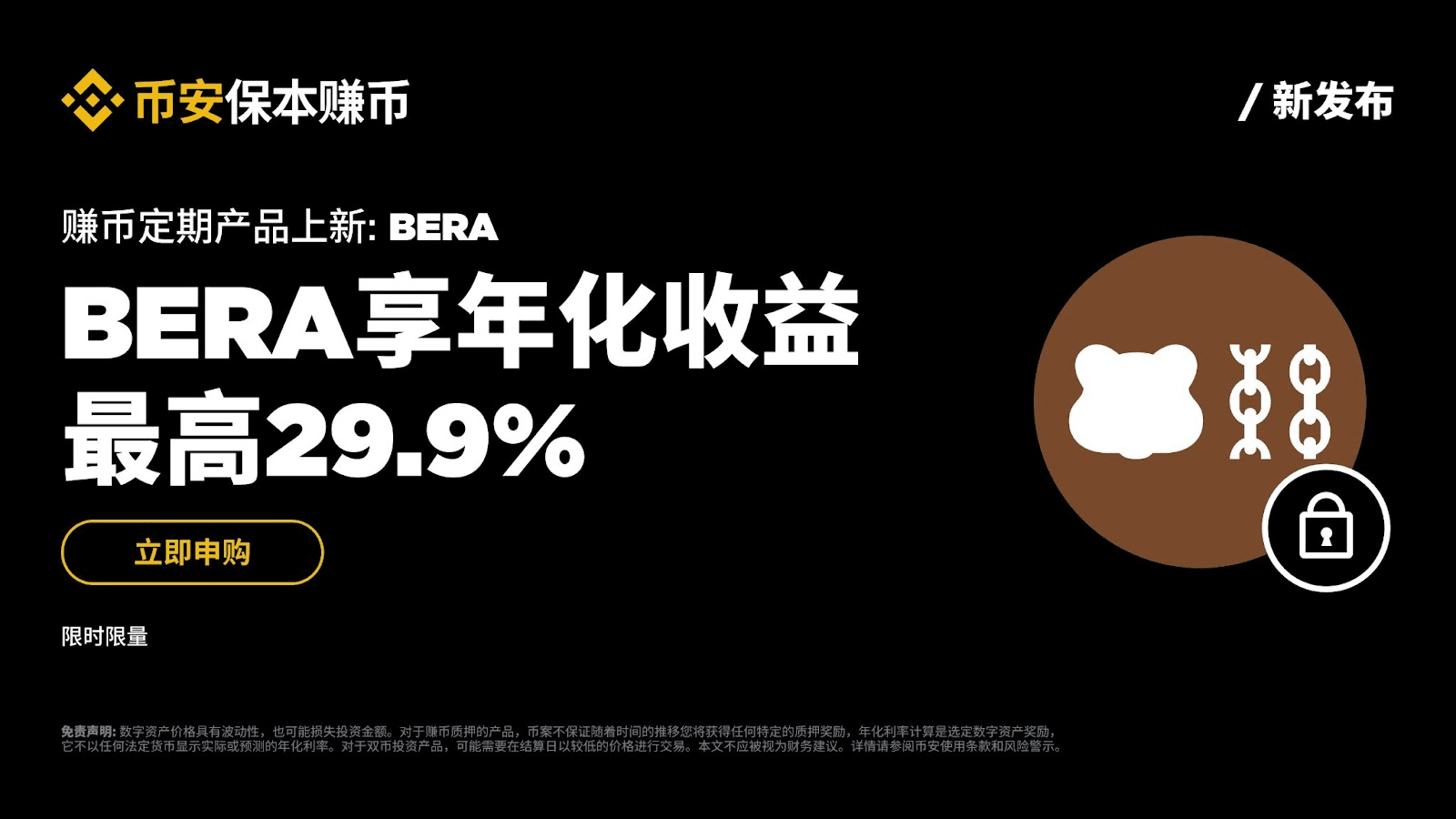 币安保本赚币平台将于2025年09月09日18:00(东八区时间)上线Berachain(BERA)定期产品,申购即可获得收益,邀您体验。