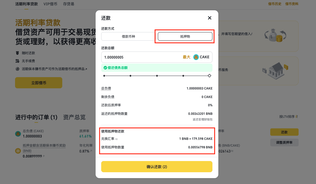为持续优化和提升用户的产品体验,质押借币(活期利率)产品现已支持用户通过线上操作使用抵押物还款。用户可以选择以借币币种偿还质押借币(活期利率)订单,亦可选择以抵押物还款。
