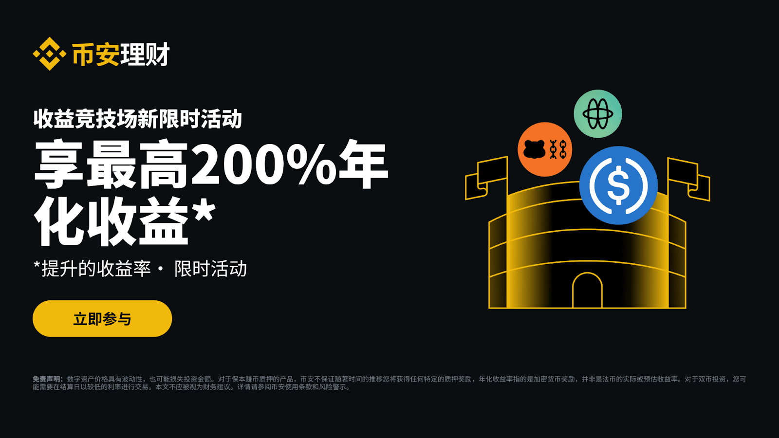 免责声明:数字资产价格具有波动性,您的投资价值可能会有所波动,也可能损失投资金额。您将自行为您的投资决策负全责,币安不对任何可能产生的损失负责。保本赚币质押产品将在协议期结束后或提前赎回时将数字资产返还至用户的现货钱包。币安不保证随著时间的推移您将获得任何特定的质押奖励。年化收益率是您在选定时间范围内获得数字资产奖励的预估值。它不以任何法定货币显示实际或预测的回报率、收益率。年化收益率每日调整,预计收益可能与实际产生的收益不同。对于双币投资产品,建议您持有加密资产并可能需要在结算日以低于市场利率的利率进行交易。本文不应被视为财务建议。详情请参阅币安使用条款和风险警示。