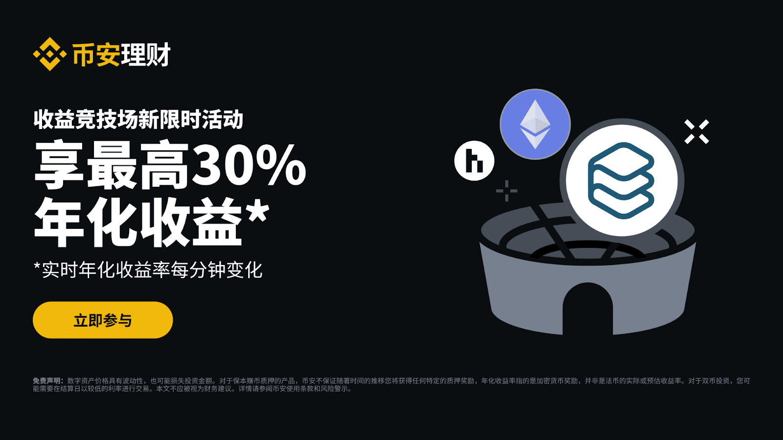 币安理财竞技场每周为您推出一系列新限时活动。请持续关注“币安理财竞技场”更多活动,通过币安保本赚币、ETH质押、SOL质押、双币投资等获得收益。
