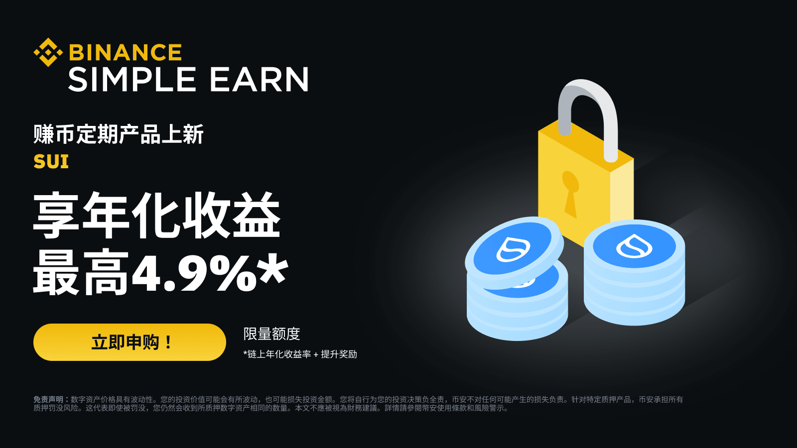 币安赚币平台将于2023年12月21日20:00(东八区时间)上线SUI定期产品,申购即可获得收益,邀您体验。