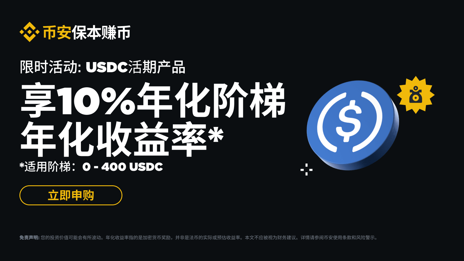 币安理财推出USDC保本赚币活期产品特别活动!活动期间,申购USDC保本赚币活期产品的用户,除了可获得实时年化收益之外,还可享受10%独家阶梯年化收益率!