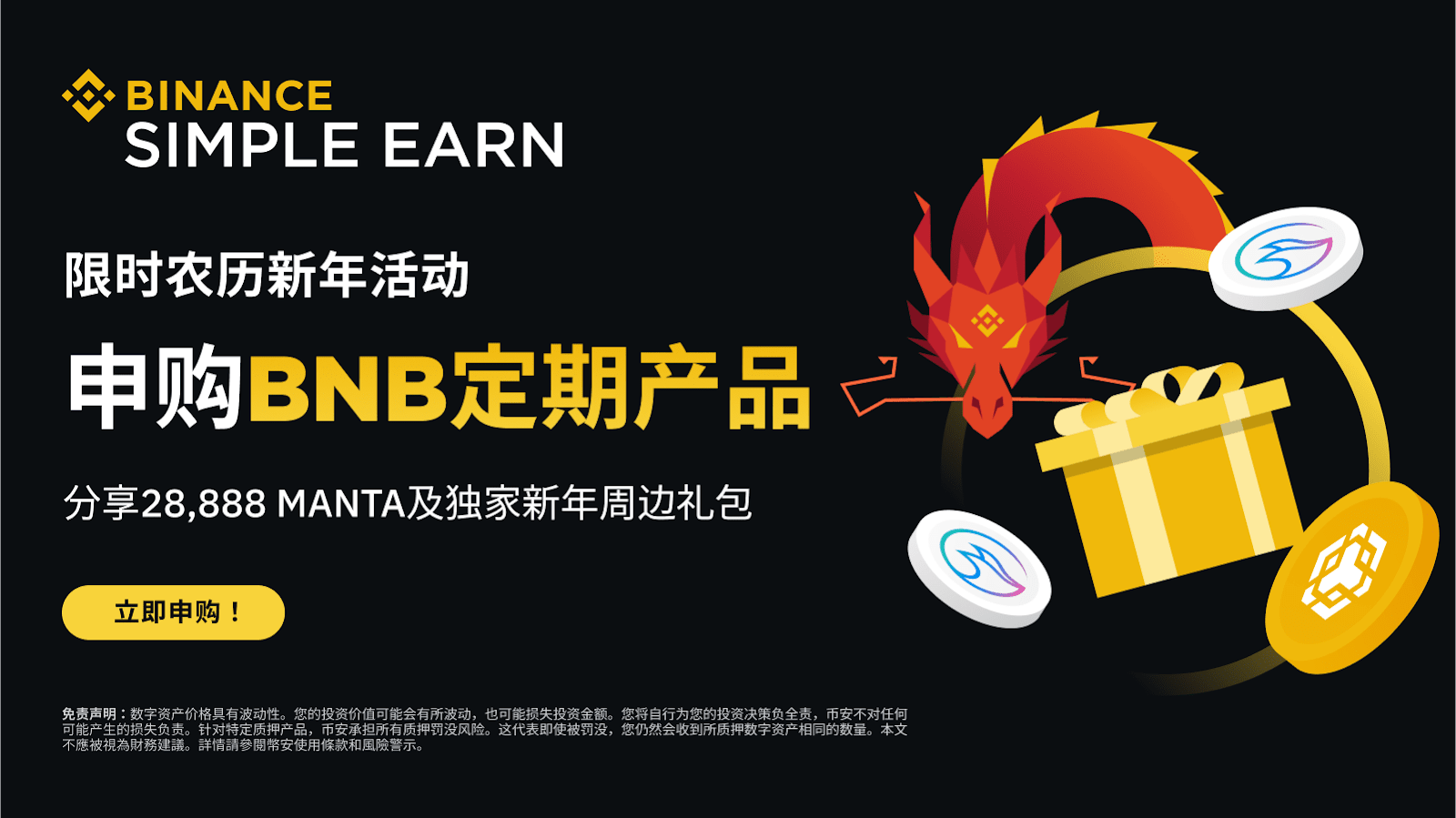 活动:申购BNB定期产品,瓜分28,888 MANTA定期产品及新年周边礼包!
