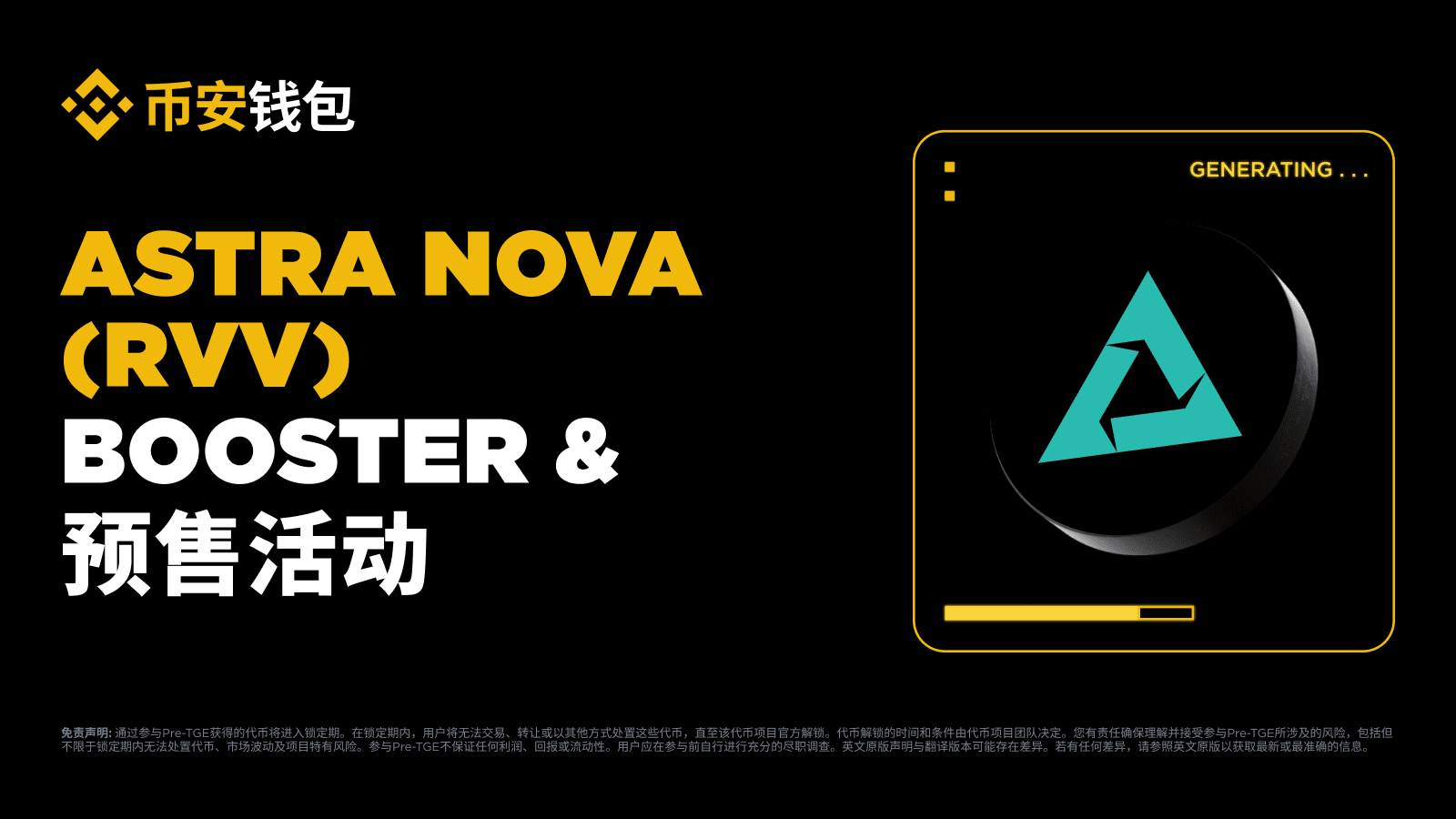 预售活动期间,用户可在币安钱包内独家认购Astra Nova代币RVV。认购采用超额认购模式,每位用户最多可存入 3 BNB。代币分配按所有参与者总存入BNB的比例进行分配。