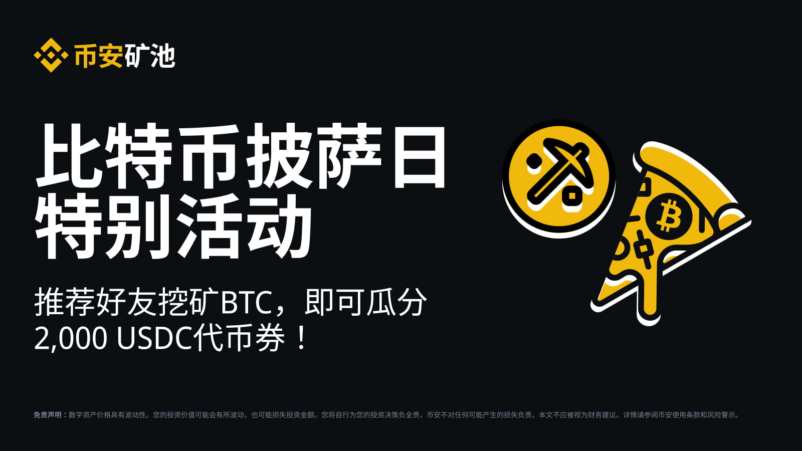 币安矿池为庆祝比特币披萨日,推荐好友开始挖矿BTC,即可赢取丰厚奖励!活动期间,推荐好友挖矿BTC并达到最高推荐好友总平均算力的前20名用户,将可额外瓜分2,000 USDC的代币券!
