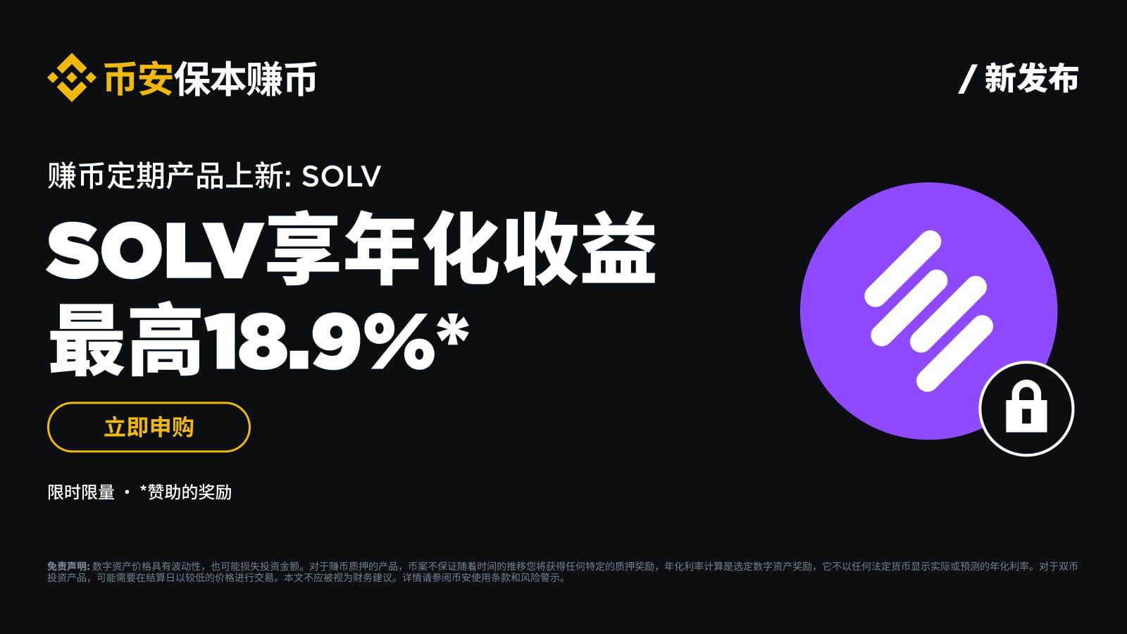 币安保本赚币平台将推出Solv Protocol(SOLV)定期产品专属活动!活动期间申购SOLV定期产品的用户,享最高18.9%*年化收益率。
