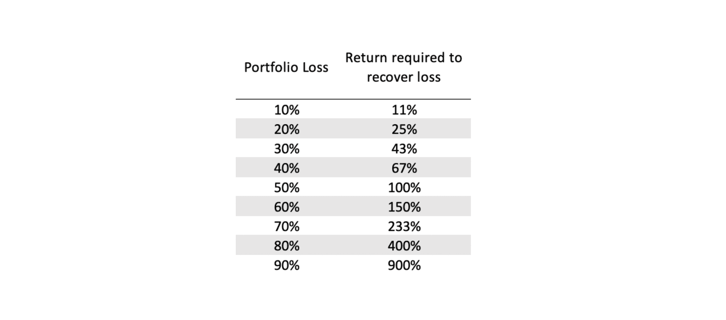 因此,在虧損事件中,投資組合需要高於虧損的獲利才能收支平衡。下圖表是在不同程度的投資組合虧損後,要達到收支平衡所需的後續獲利率。