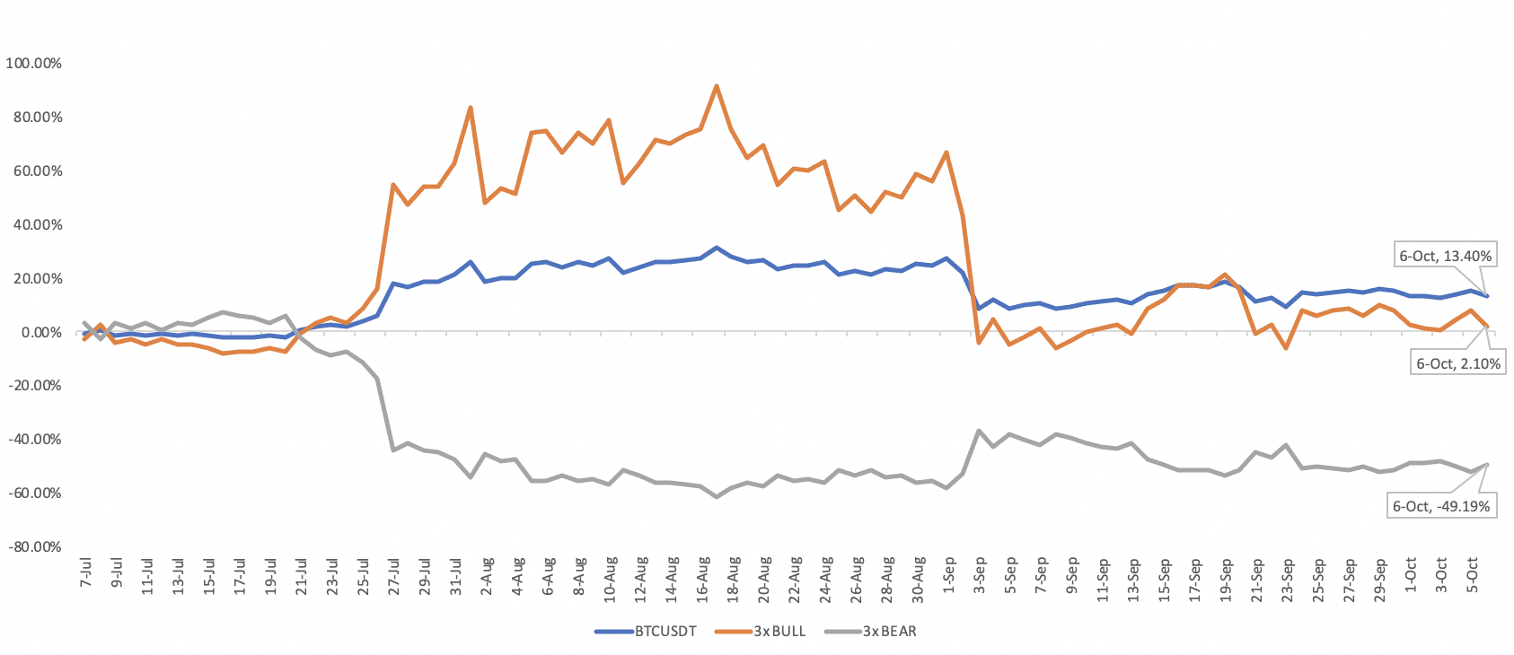 如您所見,比特幣在這段期間的累積獲利持續呈現區間波動,這是對槓桿代幣最糟糕的情況。比特幣從 7 月 6 日到 10 月 6 日的總獲利為 13.4%。其相對應的 3 倍牛市代幣相對表現不佳,收益率只有 2.1%。同時,其 3 倍熊市代幣在相同時期虧損將近 50%。