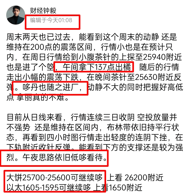早上好,新的一週從睡醒知音開始。能看到行情在凌晨走出茶針的下探至25510附近,開始反彈 一夜過去 在早間抵達26040附近回測,根據午夜看哆死路 大餅哆丹完美拿下353點 以太哆丹完美拿下20點知音出橘,又是睡醒收米的一天,新的一週 開門紅已到位 一天都心情都是美美的。
