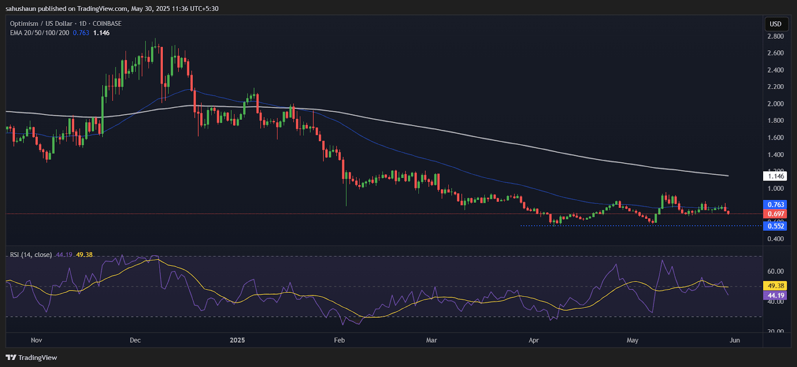 OP自2024年底峯值以來一直困在下降通道中,目前價格爲$0.696。