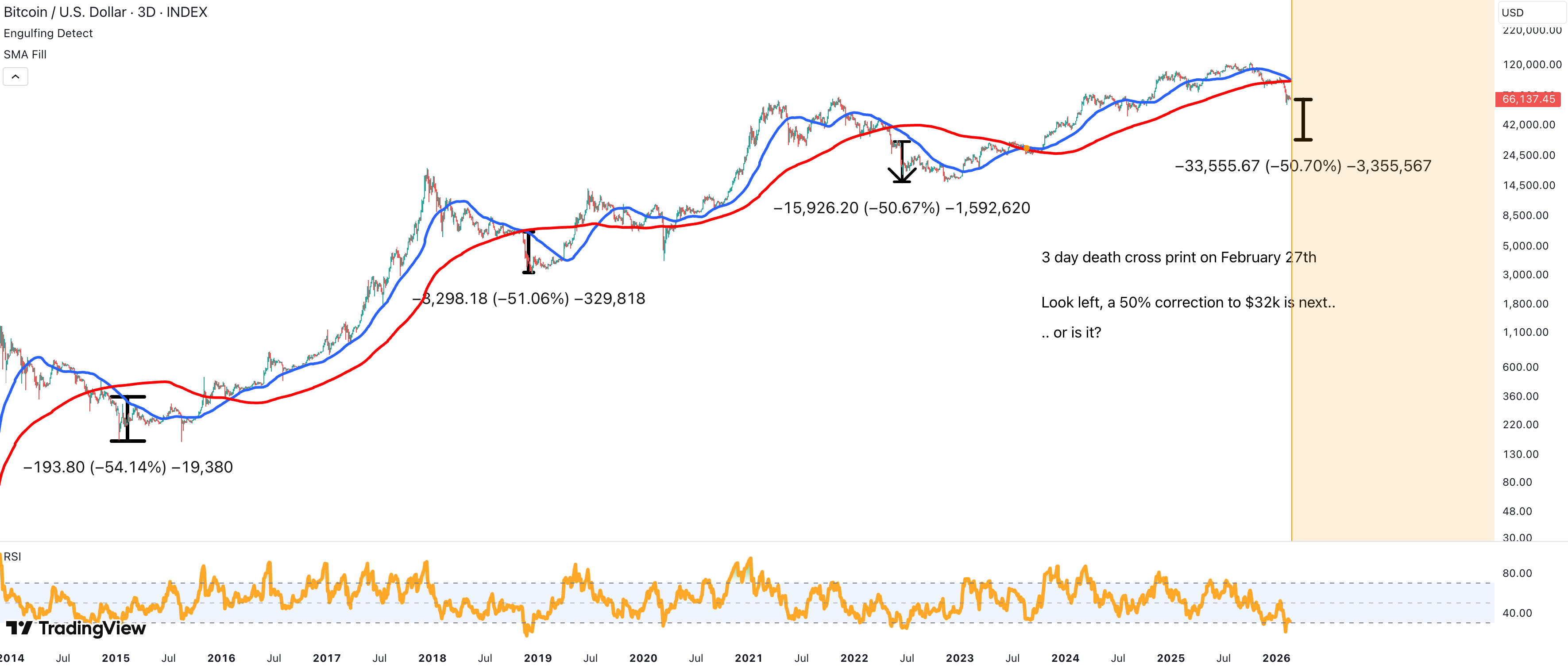 對於那些不知道的人來說,三天死亡交叉是指50日簡單移動平均線(SMA)向下穿過200日SMA,並且價格行動在200日SMA以下。