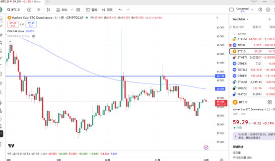 BTC.D比特幣市值佔比59.29%。在59附近橫盤了。