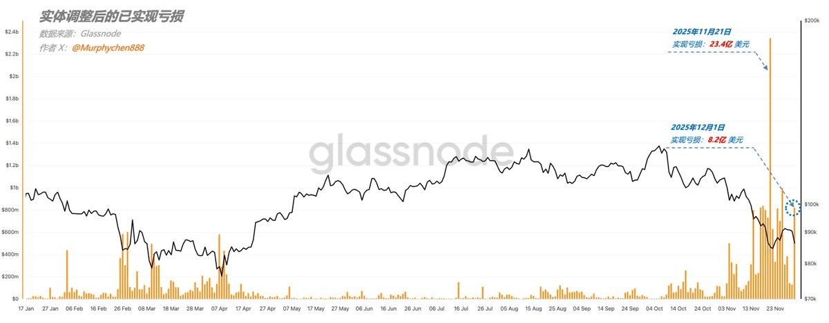 昨天早上BTC突然大幅下跌,打亂了原有的反彈節奏,讓稍有緩解的市場情緒又變得緊張起來。但從截止到今天早上的數據來看,12/1當天 EARL(實體調整後的實現虧損)爲 8.2億 美元,遠小於11/21的 23.4億 美元的規模(如圖1)。