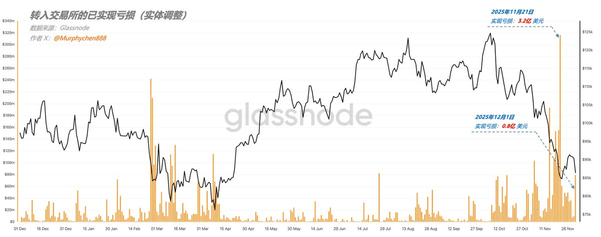 12/1當天轉入交易所的已實現虧損爲8000w美元,同樣也小於11/21的 3.2億 美元,也低於11/14和11/17這2天的虧損規模(如圖2)。