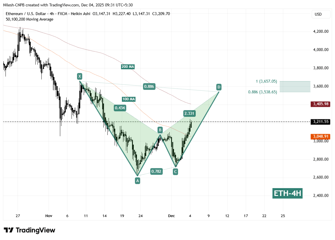 更廣泛的加密貨幣市場顯示出顯著的上行動能,因爲以太坊(ETH)在過去二十四小時內上漲超過5%。更重要的是,ETH的4小時圖表閃現出一個明確的諧波結構——通常在潛在的反轉之前,形成強趨勢延續的信號。這一次,設置指向短期內進一步上升。