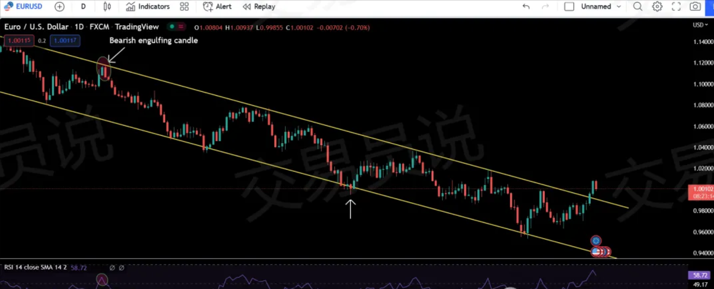 ✍ 價格通道策略:這是一種波段交易策略,交易者希望在價格通道內部交易每一段波動。價格通道是通過分別連接擺動低點與擺動高點畫出的兩條趨勢線形成的。當價格在通道趨勢線附近反彈時,就形成交易機會。通常會使用反轉K線形態作爲入場觸發信號。