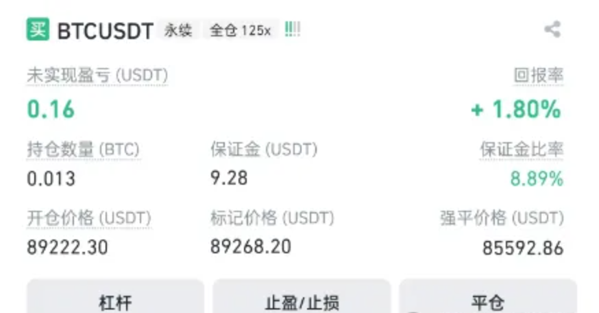 咱們先來看個典型場景。假設你用9.28 USDT的保證金,在BTCUSDT交易對上開了一手125倍的高槓杆多單,是不是已經感覺自己成了“10u戰神”?可是往下看,你可能要驚呼:哇,怎麼強平價格這麼低?開倉價格是89222.30,強平價格卻遠在85592.86。是不是有點小刺激?