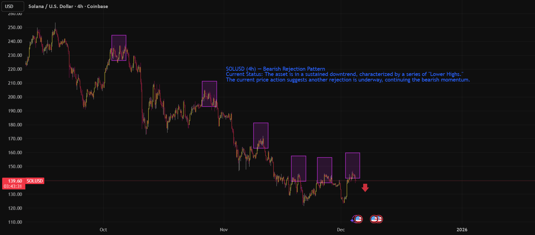 SOL/USD 正處於持續的下跌趨勢中,特徵是一個系列的“低點高”。當前的價格行動表明,另一次拒絕正在進行中,繼續看跌的動能。