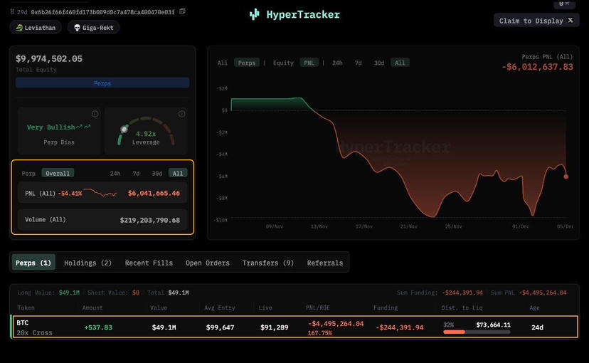 這頭鯨魚0x6b目前持有 20 倍多頭頭寸,持有 537.83 $BTC 股,價值 4910 萬美元,過去 24 天的浮動虧損爲 -449 萬美元。