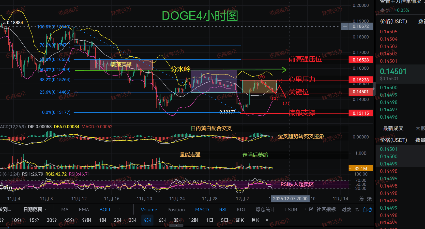 從4小時圖看,DOGE在 0.145–0.152 USDT 這個箱體裏已經躺平兩天了,上方壓力紋絲不動,看似多頭已廢。但仔細看: