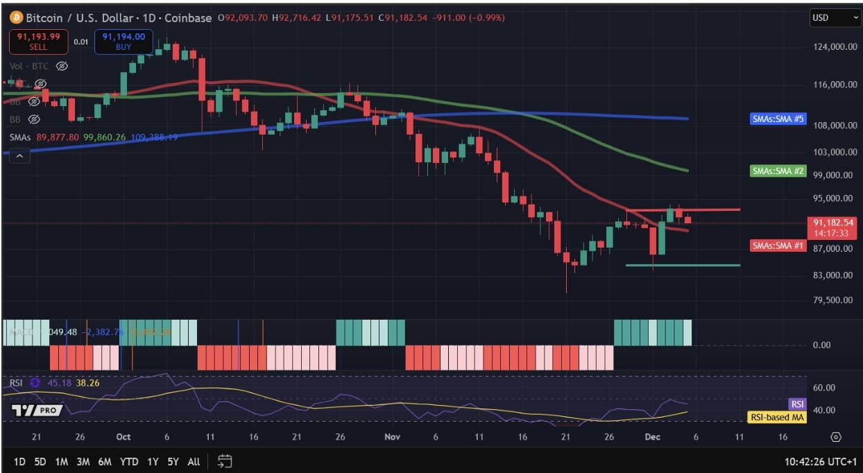 儘管面臨巨大的賣壓,比特幣在週二回升,漲幅超過2%,重新奪回了$90,000,收於$91,308。買家在週三保持控制,價格上漲2.35%,報$93,453。週四再次回到看跌區域,下跌1.46%,收於$92,093。該旗艦加密貨幣在當前交易時段下跌近1%,交易價格約爲$92,223。MACD指標顯示出潛在的積極情緒,而略微向下的RSI則表明,儘管價格走勢穩定,但動能可能正在減弱。