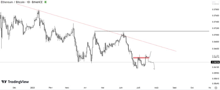 從現在開始,以太坊的目標很簡單:克服技術區域(以紅色表示),以便讓山寨幣形成強大的上漲趨勢,第一個技術目標對應於以紅色表示的傾斜阻力。 然而,自從看漲失敗並跌破 0.06 BTC 以來,現在以太坊將不得不展示其買入實力。
