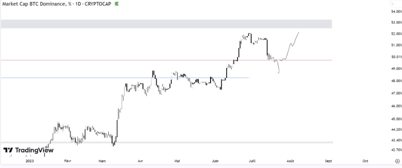 很明顯,XRP 的勝利使整個市場受益,尤其是以太坊,因爲比特幣的主導地位略有下跌,而以太坊則相對於加密貨幣之王取得了勝利。 這種趨勢在幾天前就開始出現,必須維持下去,才能隨着時間的推移山寨幣真正上漲。 目前,看漲勢頭仍然脆弱,未來幾周仍不確定。 因此,假設比特幣的主導地位下跌到 48% 以下可能是一個非常好的消息。