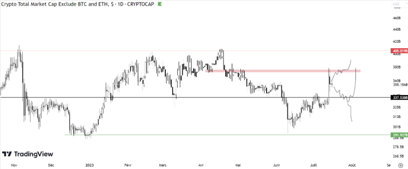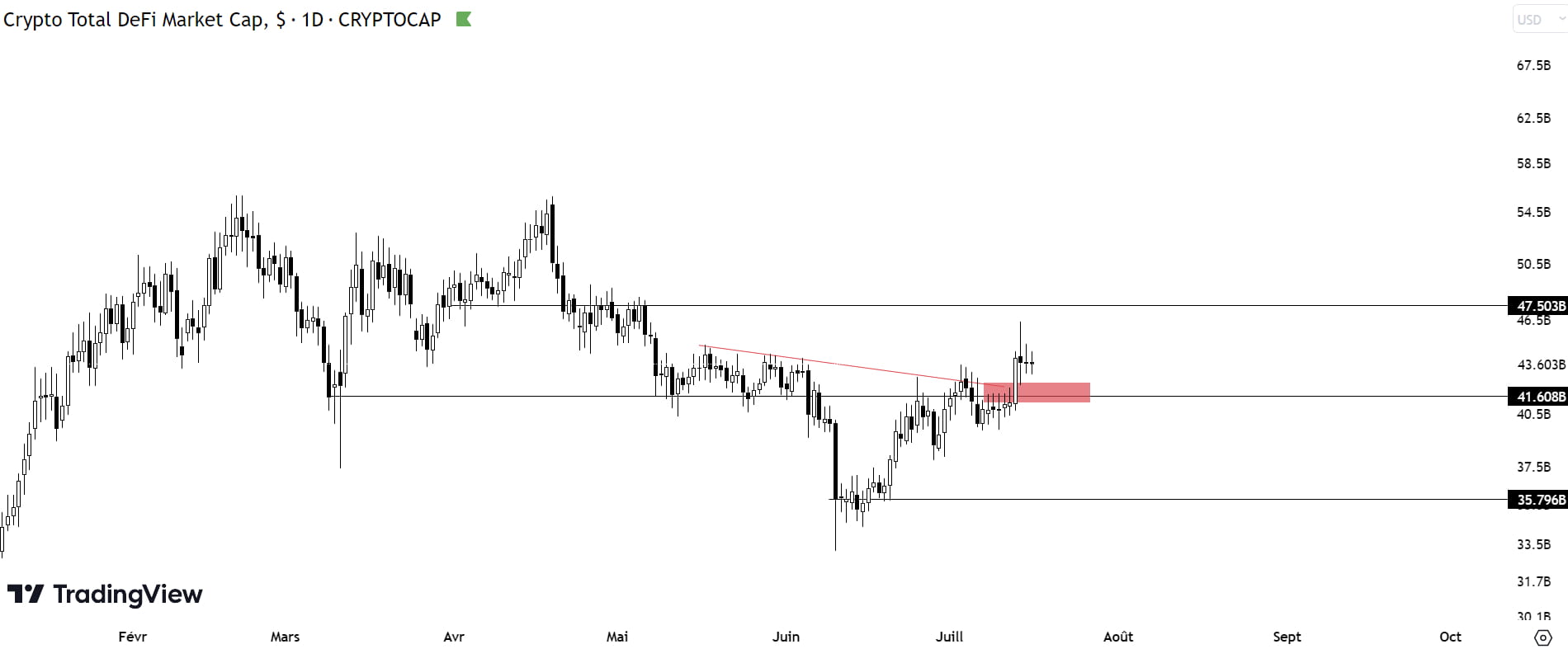 對於去中心化金融山寨幣來說,該行業顯然受益於 XRP 的勝利,因爲其市值已成功克服 410 億美元的技術阻力區。 現在,讓我們密切關注這一領域,希望市值能夠突破這一技術門檻,作爲反彈至 470 億美元的支撐。 如果沒有成功,重新進入之前的阻力位,那麼價格很有可能會回到350億美元。 目前,人們的偏見是看漲。