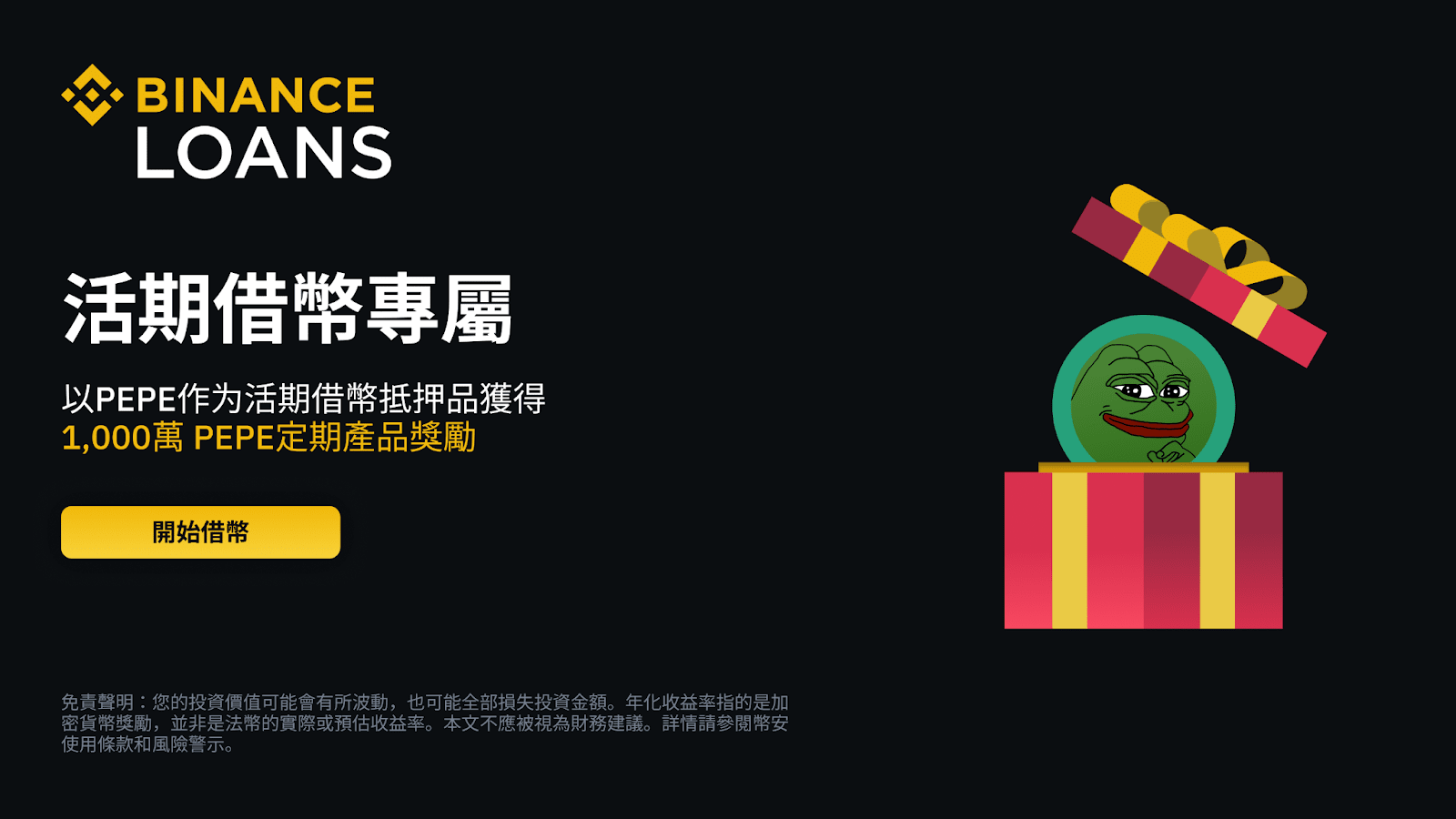 活動:以PEPE作為活期借幣抵押品借幣,即可獲得1,000萬PEPE定期產品
