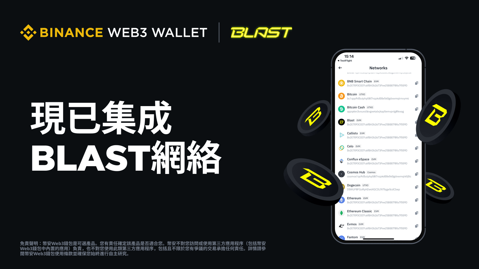 幣安Web3錢包已完成Blast網絡集成。Blast網絡是為以太坊(ETH)和穩定幣提供內置收益的以太坊二層網絡擴展解決方案。用戶可以通過幣安Web3錢包進行Blast網絡代幣轉帳,並訪問该網絡的多種dApps。