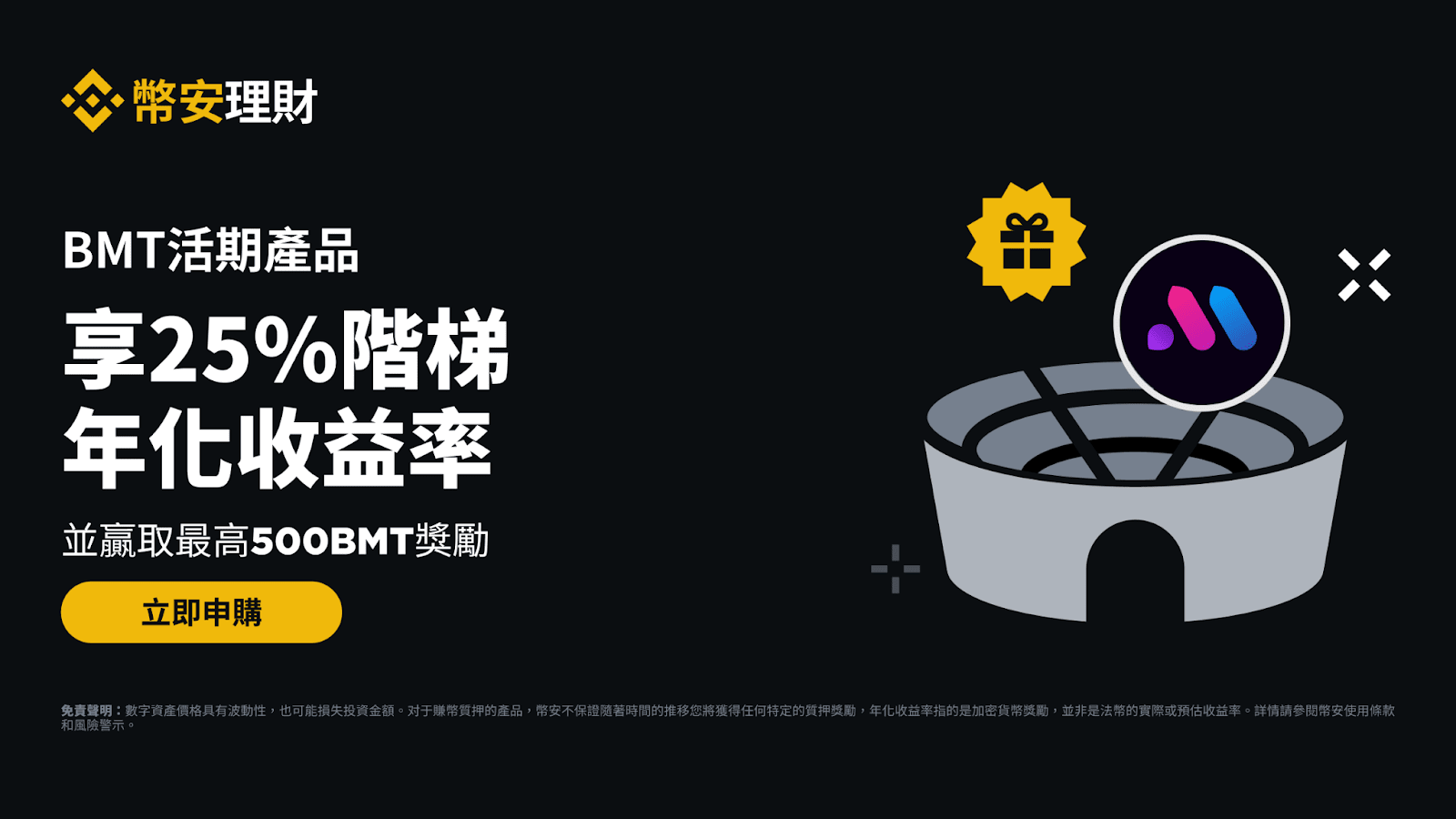 幣安保本賺幣平台推出Bubblemaps(BMT)保本賺幣產品雙重活動!活動期間,申購BMT活期產品的用戶,可享受實時年化收益以及25%階梯年化收益率!