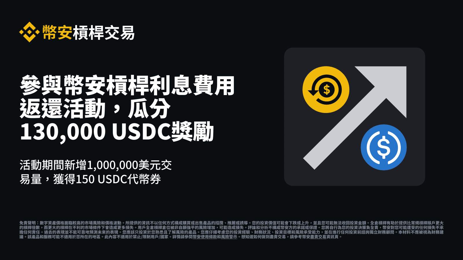 幣安槓桿為普通用戶和VIP 1-6用戶推出利息費用返還活動。活動期間,滿足任意槓桿產品交易量提升標準的合格用戶,將有資格瓜分130,000 USDC代幣券。