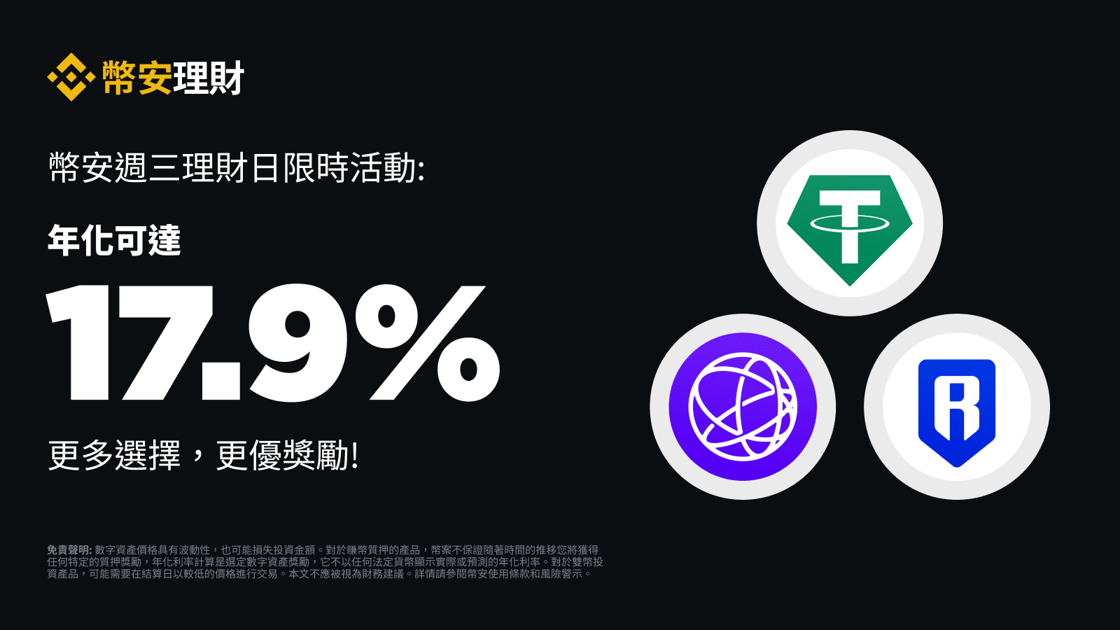幣安理財每週三為您推出一系列新限時活動。請持續關注“幣安週三理財日”,透過幣安賺幣、BNB收益池、ETH 質押、雙幣投資等獲得收益。