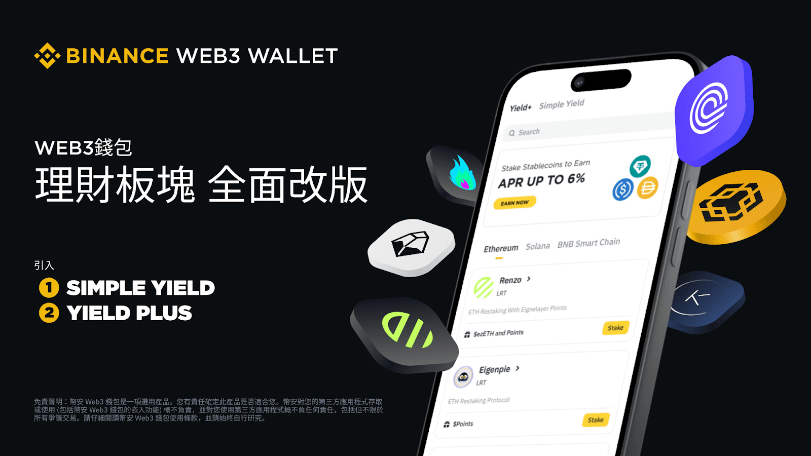 幣安Web3錢包將在理財板塊推出兩個新功能:Yield Plus和Simple Yield。用戶可以透過幣安Web3錢包理財板塊發掘更多DeFi收益機會。