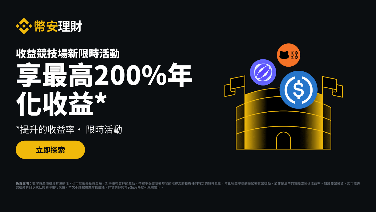 免責聲明:數字資產價格具有波動性,您的投資價值可能會有所波動,也可能損失投資金額。您將自行為您的投資決策負全責,幣安不對任何可能產生的損失負責。保本賺幣質押產品將在協議期結束後或提前贖回時將數字資產返還至用戶的現貨錢包。幣安不保證隨著時間的推移您將獲得任何特定的質押獎勵。年化收益率是您在選定時間範圍內獲得數字資產獎勵的預估值。它不以任何法定貨幣顯示實際或預測的回報率、收益率。年化收益率每日調整,預計收益可能與實際產生的收益不同。對於雙幣投資產品,建議您持有加密資產並可能需要在結算日以低於市場利率的利率進行交易。本文不應被視為財務建議。詳情請參閱幣安使用條款和風險警示。