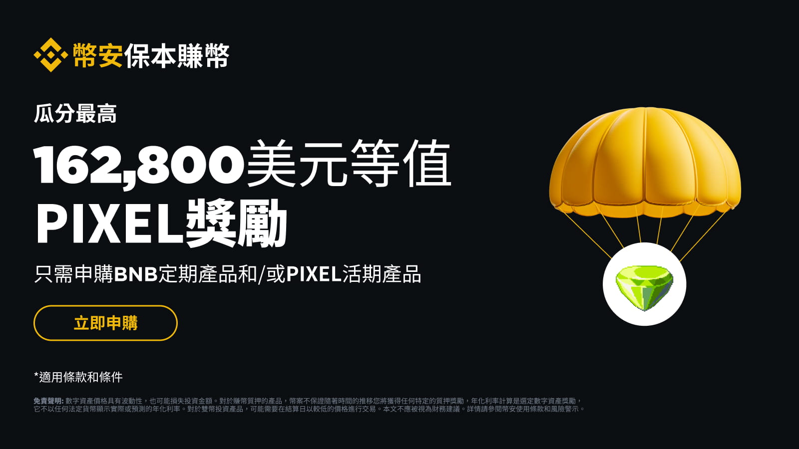 符合資格的用戶須至少申購0.5 BNB到BNB定期產品,和/或申購PIXEL活期產品才有資格參與活動。 符合資格的用戶將按照活動總積分在排行榜上進行排名,並有機會瓜分PIXEL獎勵,如下表: