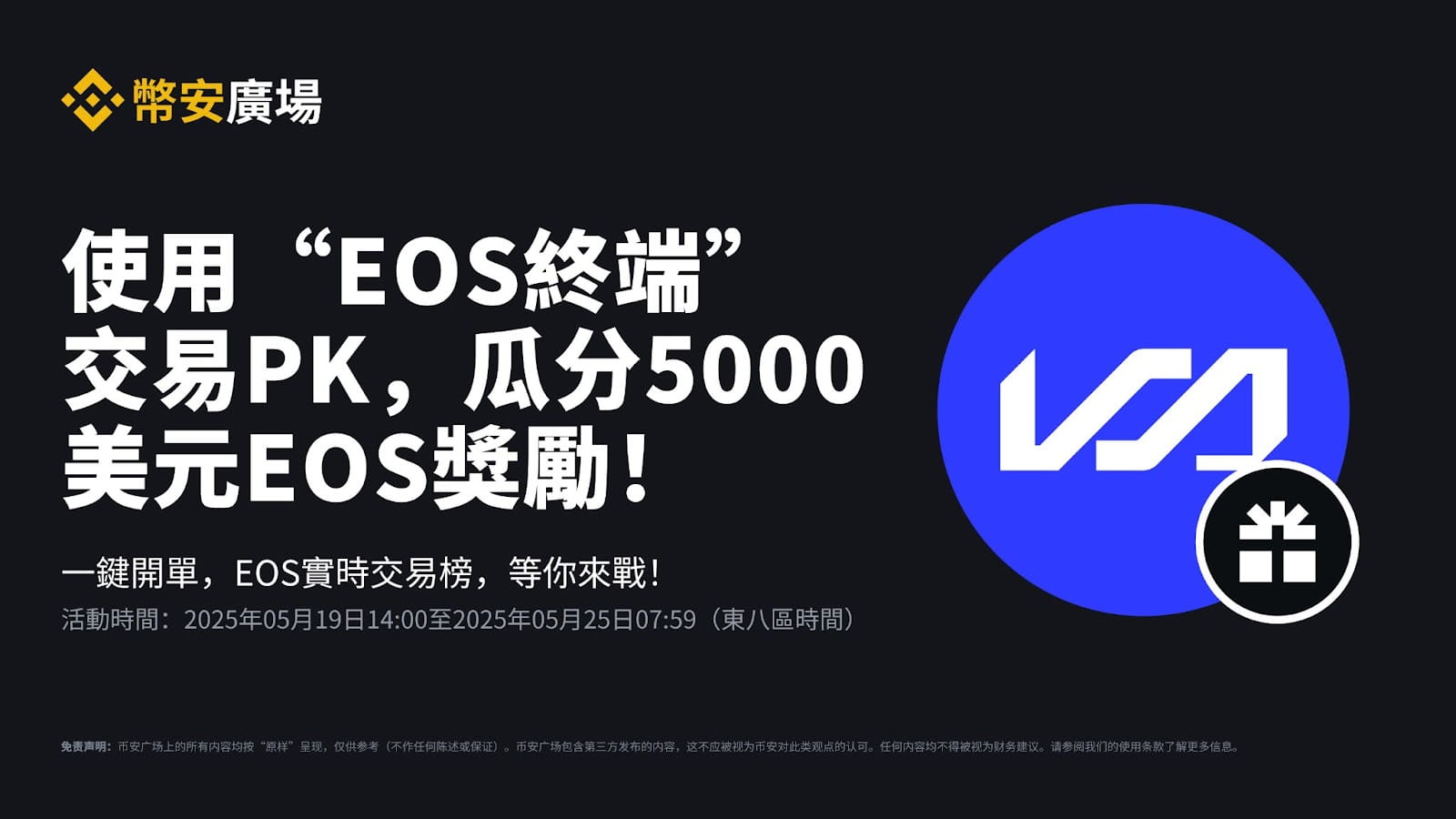 幣安廣場攜手Vaulta推出EOS交易終端分享挑戰賽!通過EOS交易終端分享您的EOS交易,符合條件的參與者,將有機會瓜分5,000美元等值EOS代幣獎勵!
