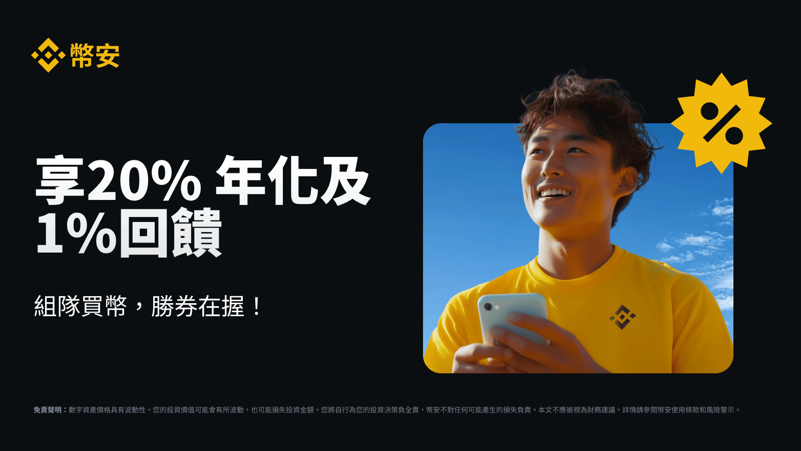 幣安推出限時活動,符合資格的用戶可與其被推薦人組成團隊加入團體競賽。排名靠前的隊伍有機會獲得最高 100 USDT的USDT保本賺幣定期產品7天獨家20%年化收益率 ,並獲得 1%BTC代幣券。符合資格的推薦人還有機會獲得幣安周邊。