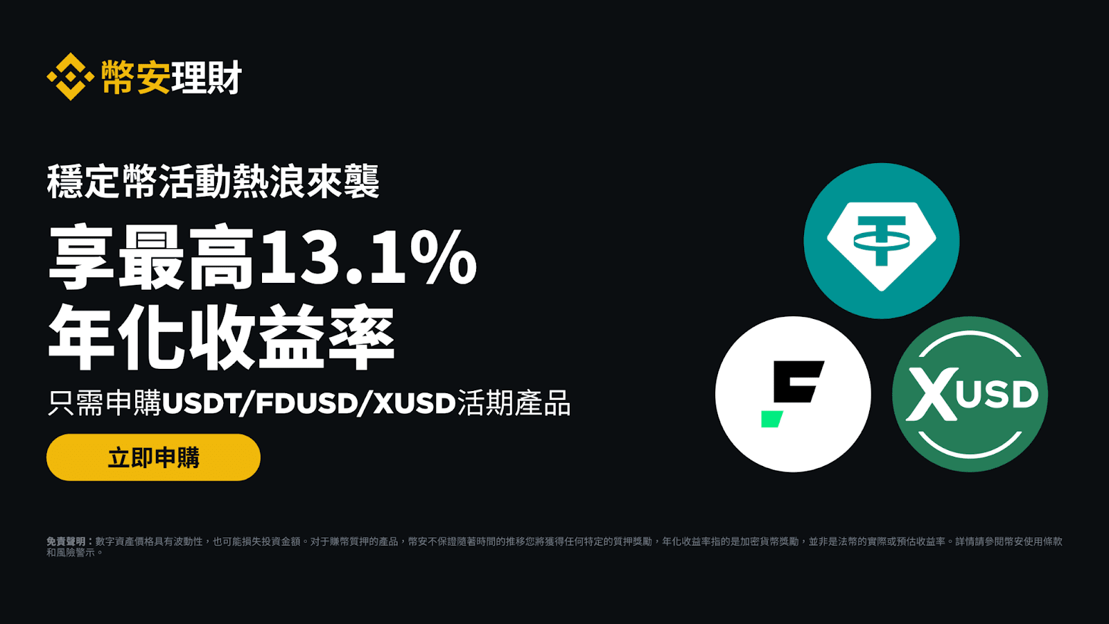 年化收益來源為幣安的自有資金,發放金額將根據對當前市場狀況的評估和評價而定。本活動與USDT、FDUSD或XUSD發行方無關。