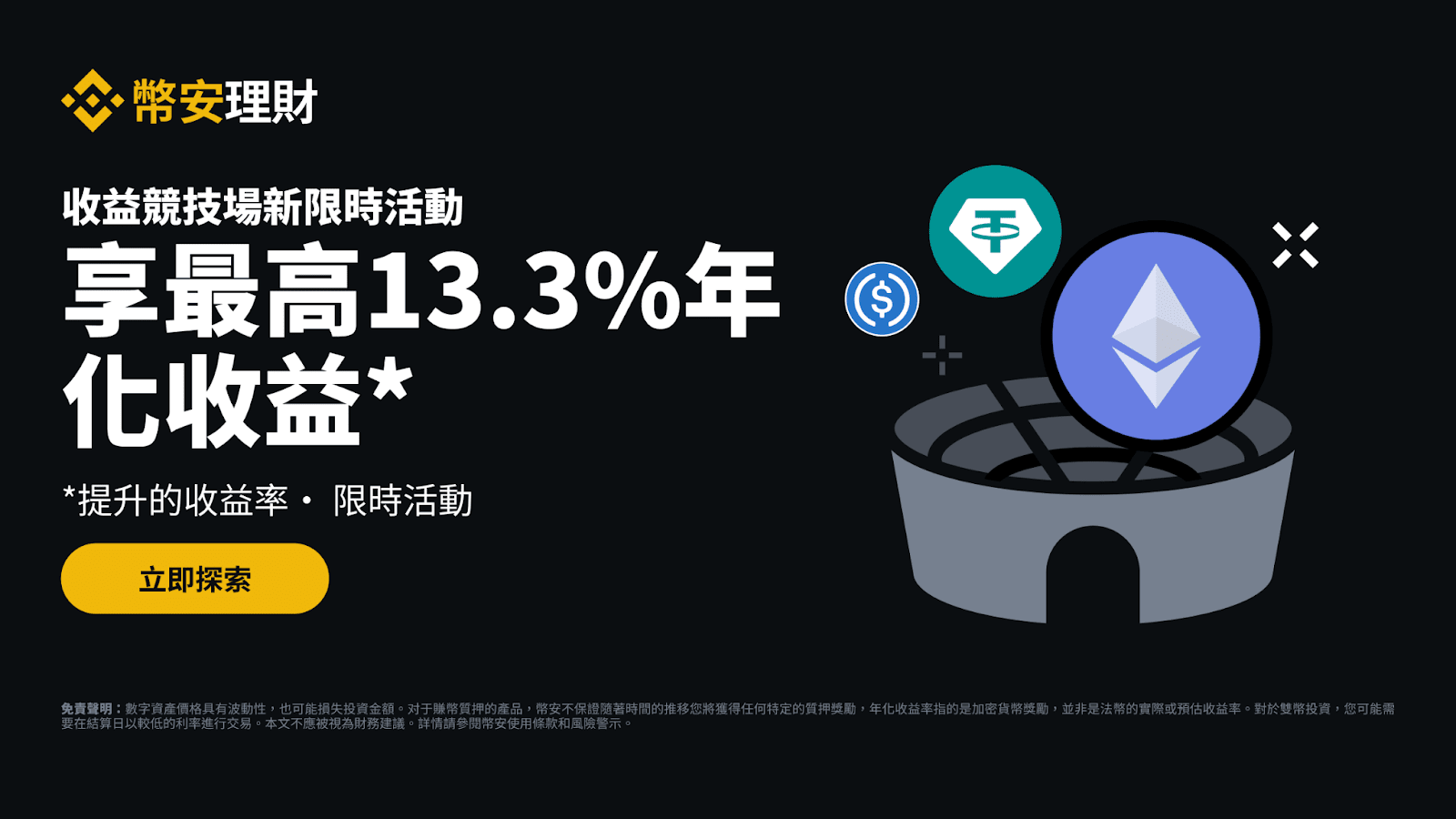 免責聲明:數字資產價格具有波動性,您的投資價值可能會有所波動,也可能損失投資金額。您將自行為您的投資決策負全責,幣安不對任何可能產生的損失負責。保本賺幣質押產品將在協議期結束後或提前贖回時將數字資產返還至用戶的現貨錢包。幣安不保證隨著時間的推移您將獲得任何特定的質押獎勵。年化收益率是您在選定時間範圍內獲得數字資產獎勵的預估值。它不以任何法定貨幣顯示實際或預測的回報率、收益率。年化收益率每日調整,預計收益可能與實際產生的收益不同。對於雙幣投資產品,建議您持有加密資產並可能需要在結算日以低於市場利率的利率進行交易。本文不應被視為財務建議。詳情請參閱幣安使用條款和風險警示。