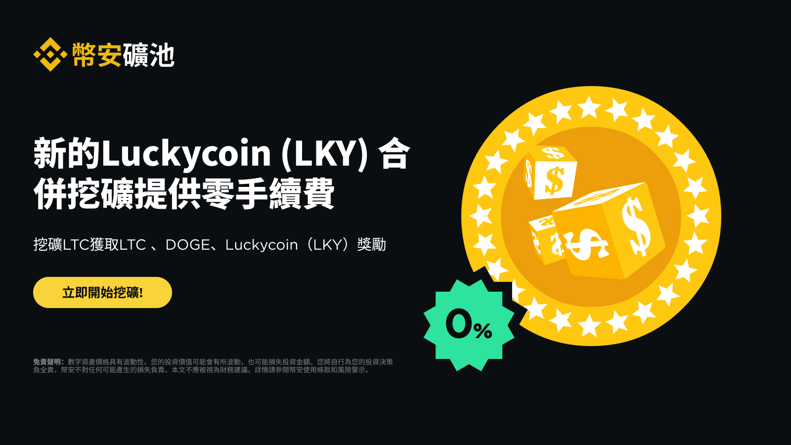 幣安礦池推出Luckycoin(LKY)合併挖礦。挖Litecoin(LTC)獲取LTC、Dogecoin(DOGE)、BEL(Bellscoin)和Luckycoin (LKY)獎勵。活動期間,Luckycoin(LKY)享受礦池零手續費。
