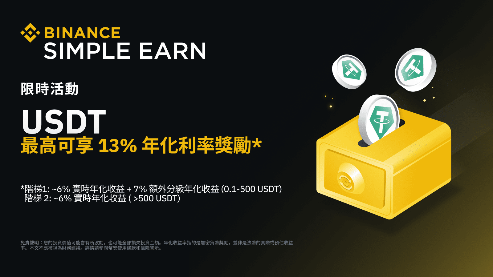 幣安賺幣平台將推出USDT活期產品活動!活動期間,申購USDT賺幣活期產品,除了可獲得實時年化收益之外(約6%),還可享受最高7%獨家額外分級年化收益!